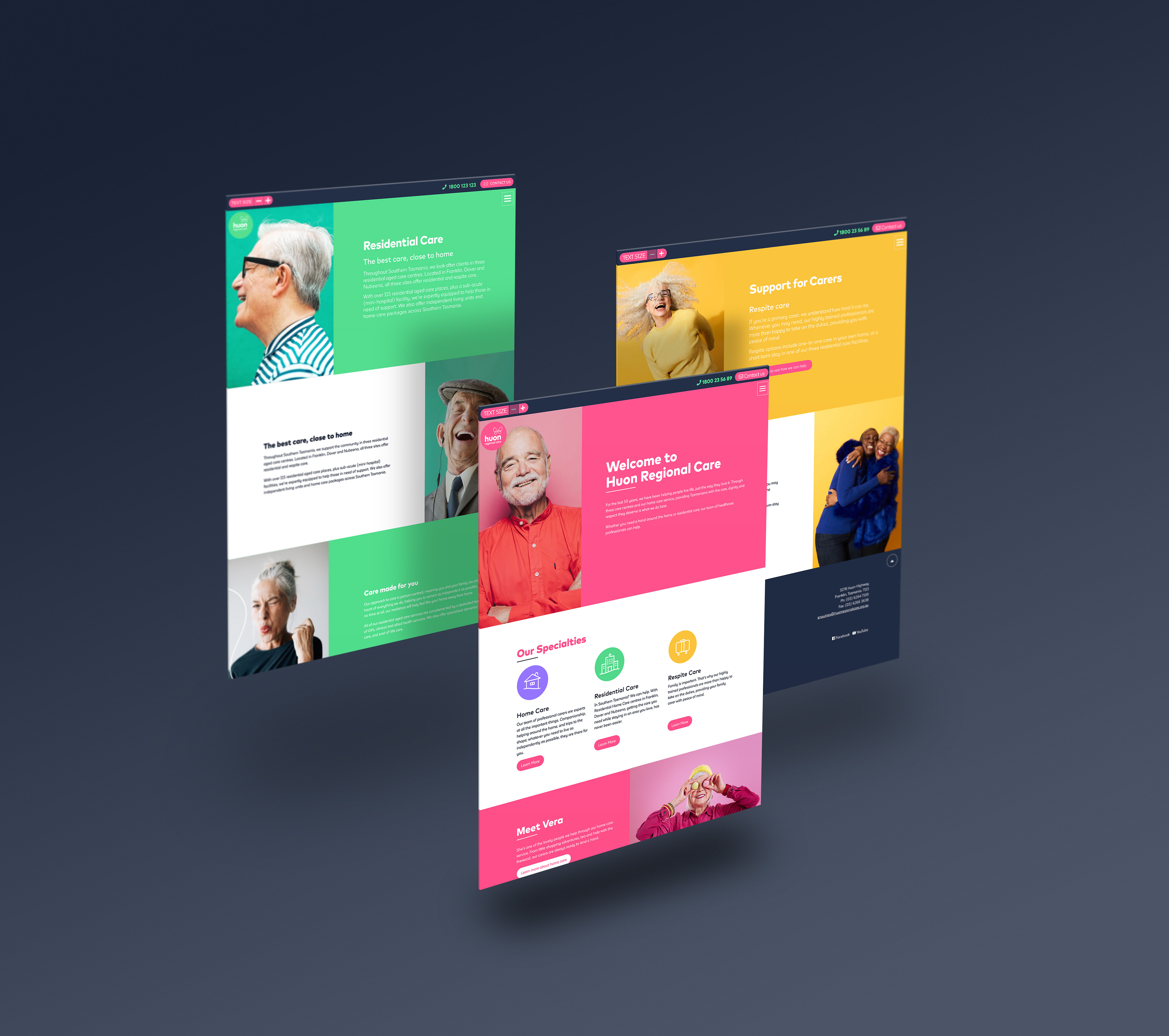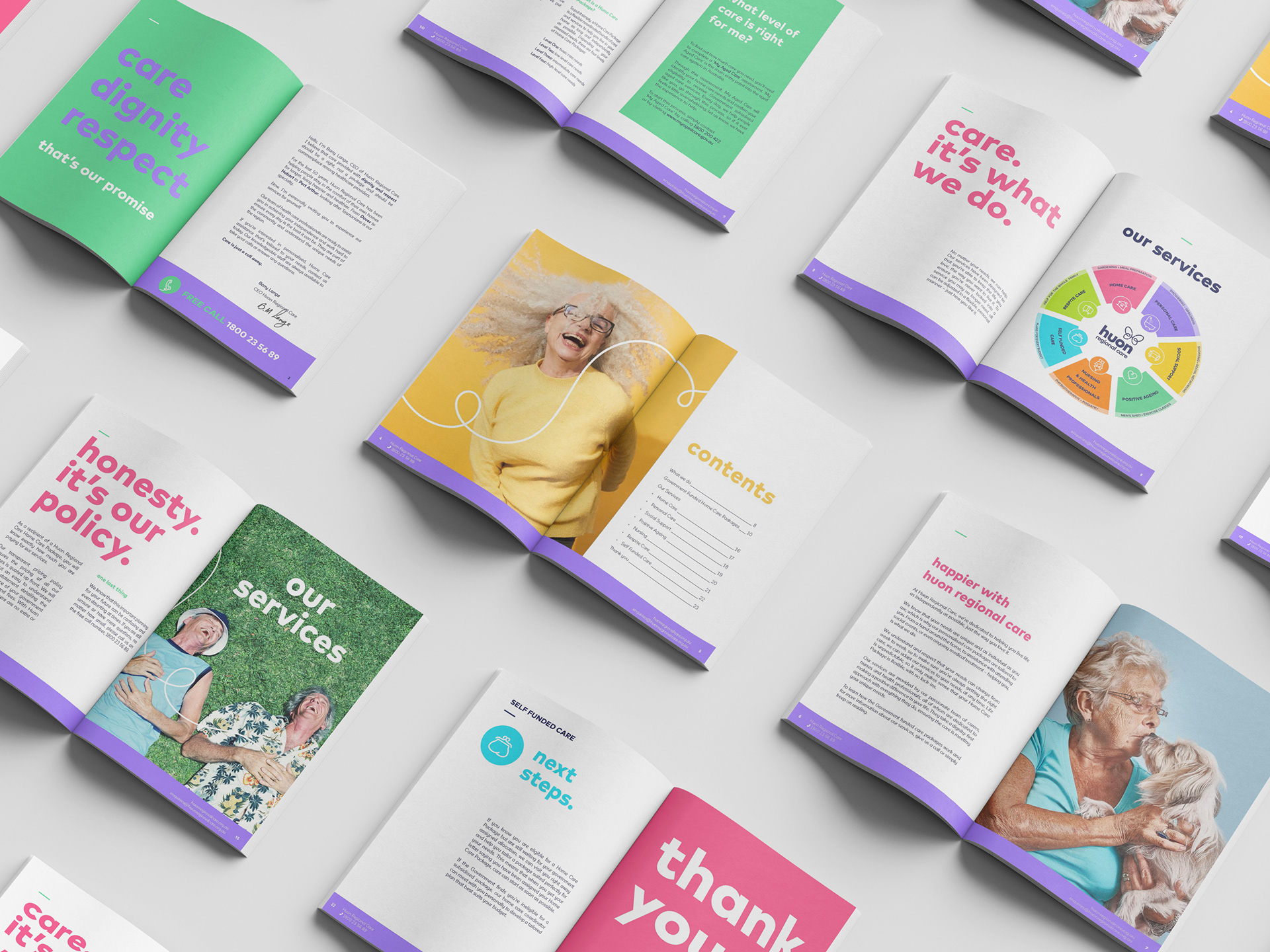 But the real game-changer? A continuous line graphic device symbolizing connection, the kind that exists between Huon’s carers and residents. Paired with thoughtful, locally shot photography and spacious layouts, the brand began to feel warm, personal, and quietly confident.